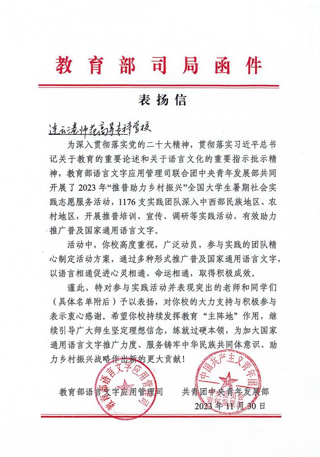 教育部語言文字應(yīng)用管理司和共青團(tuán)中央青年發(fā)展部來信表揚(yáng),充分肯定了我校在“推普助力鄉(xiāng)村振興”志愿服務(wù)活動(dòng)中的突出表現(xiàn)。學(xué)校將繼續(xù)深入貫徹落實(shí)習(xí)近平總書記關(guān)于教育的重要論述和關(guān)于語言文字工作的重要指示批示精神,響應(yīng)國家號(hào)召,發(fā)揮教育“主陣地”作用,繼續(xù)引導(dǎo)廣大師生堅(jiān)定理想信念,積極探索推普助力鄉(xiāng)村振興新路徑,為加大國家通用語言文字推廣力度、服務(wù)鑄牢中華民族共同體意識(shí)、助力鄉(xiāng)村振興戰(zhàn)略作出新的更大貢獻(xiàn)。