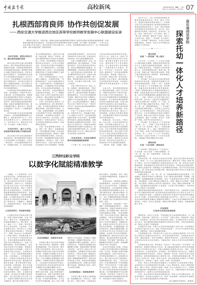 9月23日,《中國教育報》第07版刊發(fā)校長姚榮斌署名文章《探索托幼一體化人才培養(yǎng)新路徑》。文章從構(gòu)建“一貫雙融”育人模式、打造“三階四維”課程體系、打造多元協(xié)同的教育格局三個方面,深度闡述了學(xué)校托幼一體化人才培養(yǎng)模式改革的實(shí)踐路徑。