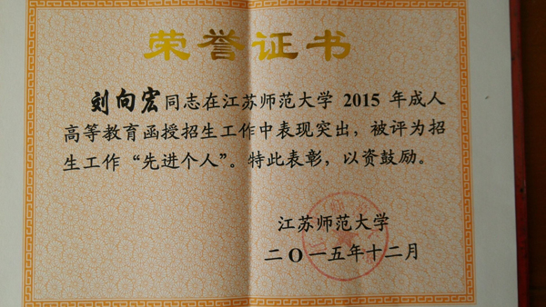 會(huì)議還對(duì)2015年度繼續(xù)教育招生工作中做出突出成績(jī)的四家先進(jìn)單位和四位先進(jìn)個(gè)人予以通報(bào)表彰。連云港師范高等專(zhuān)科學(xué)校函授站被表彰為江蘇師范大學(xué)2015年度繼續(xù)教育招生工作先進(jìn)單位,繼續(xù)教育學(xué)院劉向宏老師被表彰為先進(jìn)個(gè)人。特向獲獎(jiǎng)單位和個(gè)人表示祝賀。