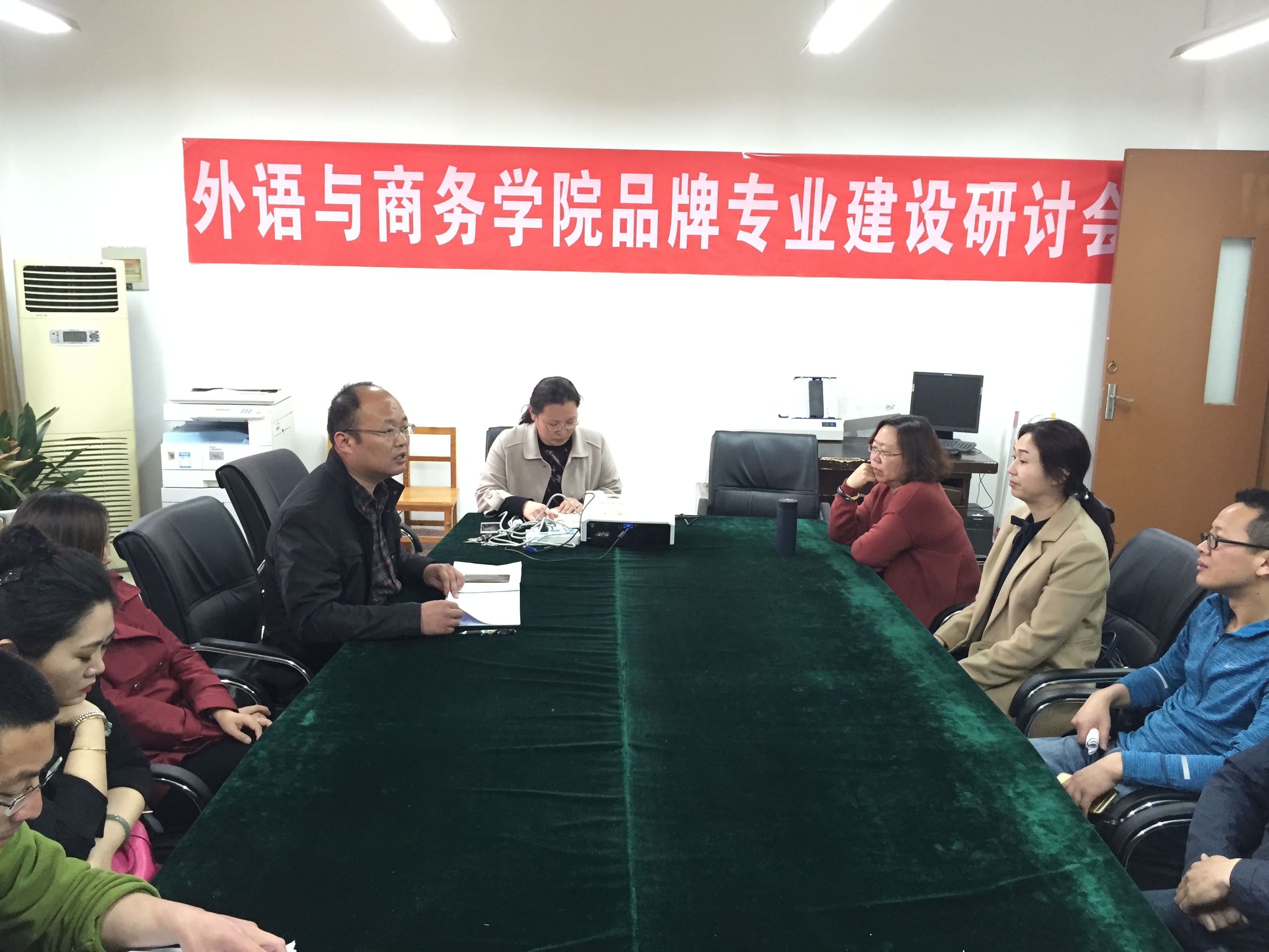 2016年4月13日下午,外語(yǔ)與商務(wù)學(xué)院在大同樓4樓會(huì)議室召開品牌專業(yè)建設(shè)研討會(huì)。會(huì)議由副院長(zhǎng)王麗萍主持,副院長(zhǎng)陳磊、旅游管理教研室全體成員及相關(guān)專業(yè)教師參加了本次會(huì)議。