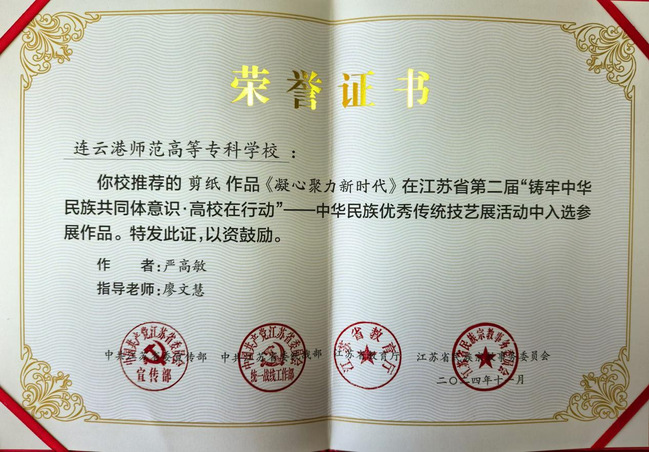 近日,由江蘇省民宗委、省委宣傳部、省委統(tǒng)戰(zhàn)部、省教育廳主辦,蘇州大學(xué)承辦的江蘇省第二屆“鑄牢中華民族共同體意識(shí)·高校在行動(dòng)”鑄牢中華民族共同體意識(shí)知識(shí)競(jìng)賽決賽暨總結(jié)大會(huì)落下帷幕。由我校美術(shù)學(xué)院廖文慧老師指導(dǎo),22環(huán)境藝術(shù)設(shè)計(jì)班嚴(yán)高敏同學(xué)創(chuàng)作的剪紙作品《凝心聚力新時(shí)代》入選江蘇省第二屆“鑄牢中華民族共同體意識(shí)·高校在行動(dòng)”——中華民族優(yōu)秀傳統(tǒng)技藝展活動(dòng)參展作品。