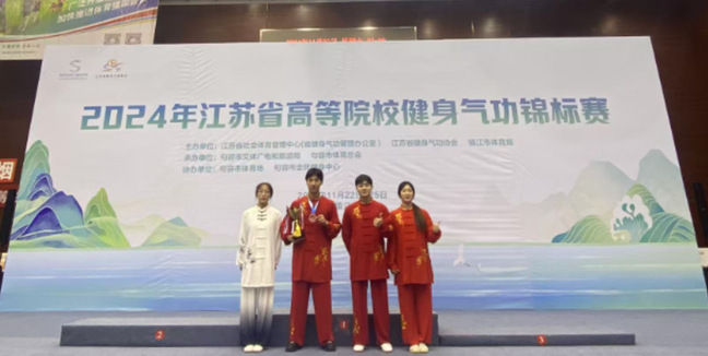 近日,2024年江蘇省高等院校健身氣功錦標(biāo)賽在鎮(zhèn)江句容舉行。此次比賽共有來(lái)自32所院校56支代表隊(duì)270余人參加,我校代表隊(duì)獲得一等獎(jiǎng)2項(xiàng)、二等獎(jiǎng)4項(xiàng)的優(yōu)異成績(jī)。學(xué)校獲得“體育道德風(fēng)尚獎(jiǎng)”。