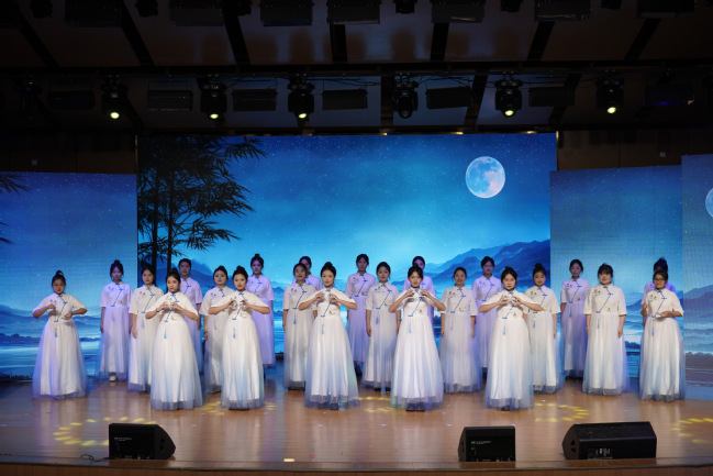 本場音樂會從“古調悠悠、海州情韻、在海一方”三個篇章進行創(chuàng)意和演繹,并在傳統(tǒng)曲調的基礎上進行了改編、融合,將大眾熟悉的曲目用五大宮調的曲牌展現(xiàn)出來。通過音、詩、畫等多種表演形式,打破了以往傳統(tǒng)海州五大宮調坐唱的展現(xiàn)方式,以重唱、對唱、小合唱、大合唱等形式,結合舞臺情景表演,為師生呈現(xiàn)了一場視聽的盛宴。